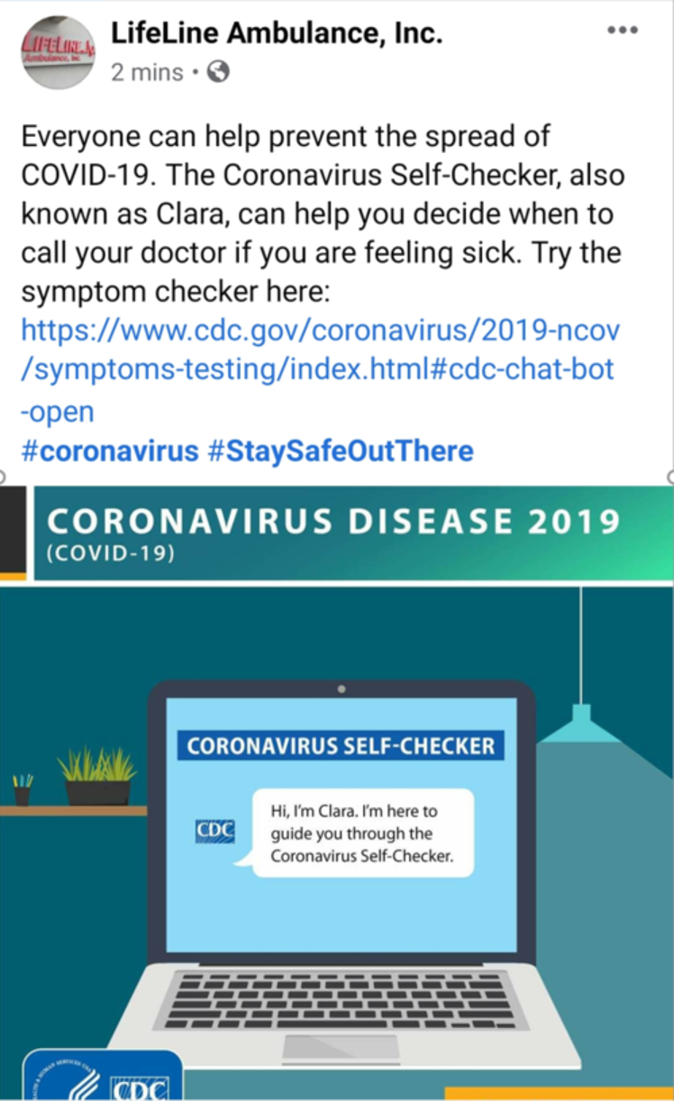 · LifeLine Ambulance Inc shared info on a really neat CDC Coronavirus Self-Checker chatbot known as Clara, info attached, link: https://www.cdc.gov/coronavirus/2019-ncov/symptoms-testing/symptoms.html#cdc-chat-bot-open